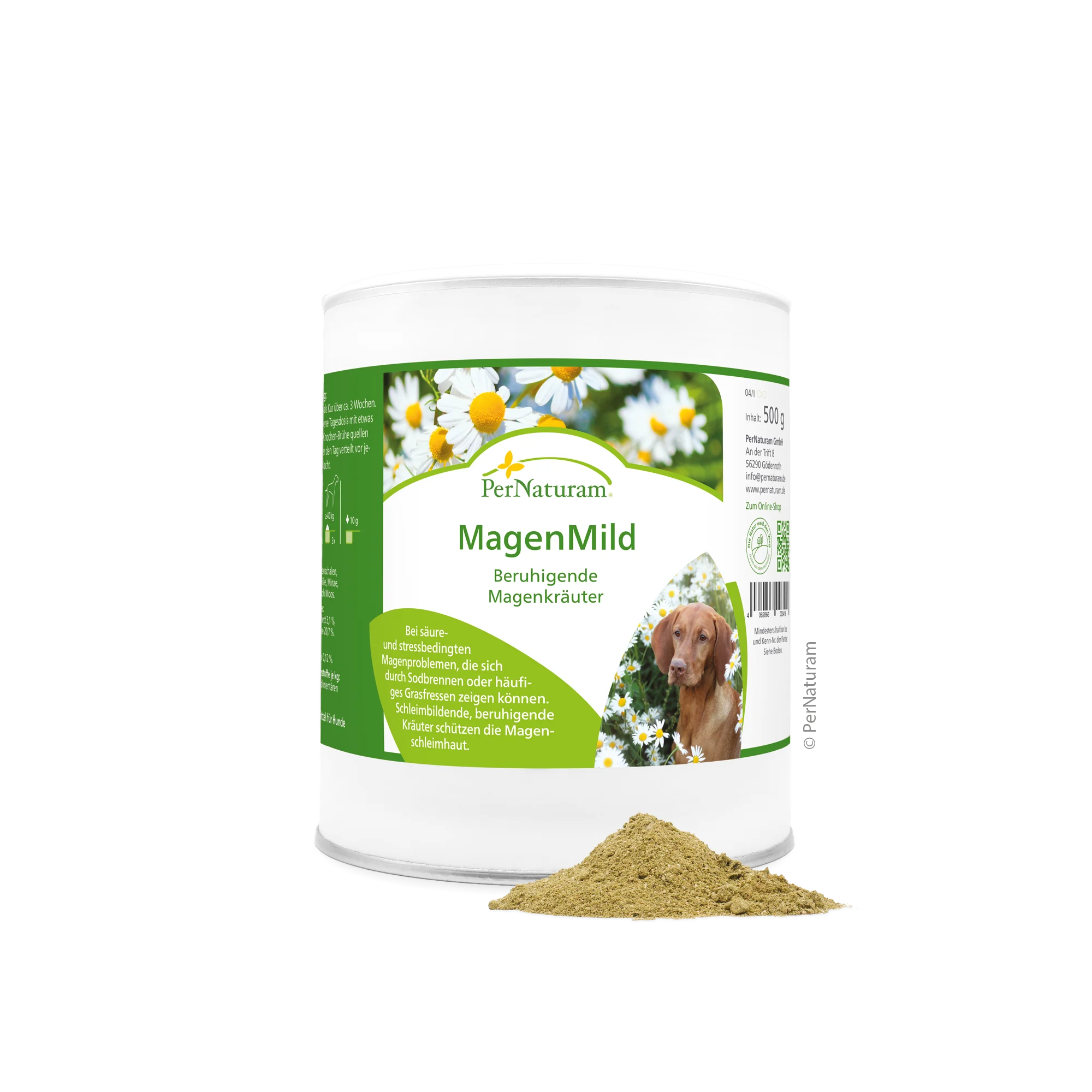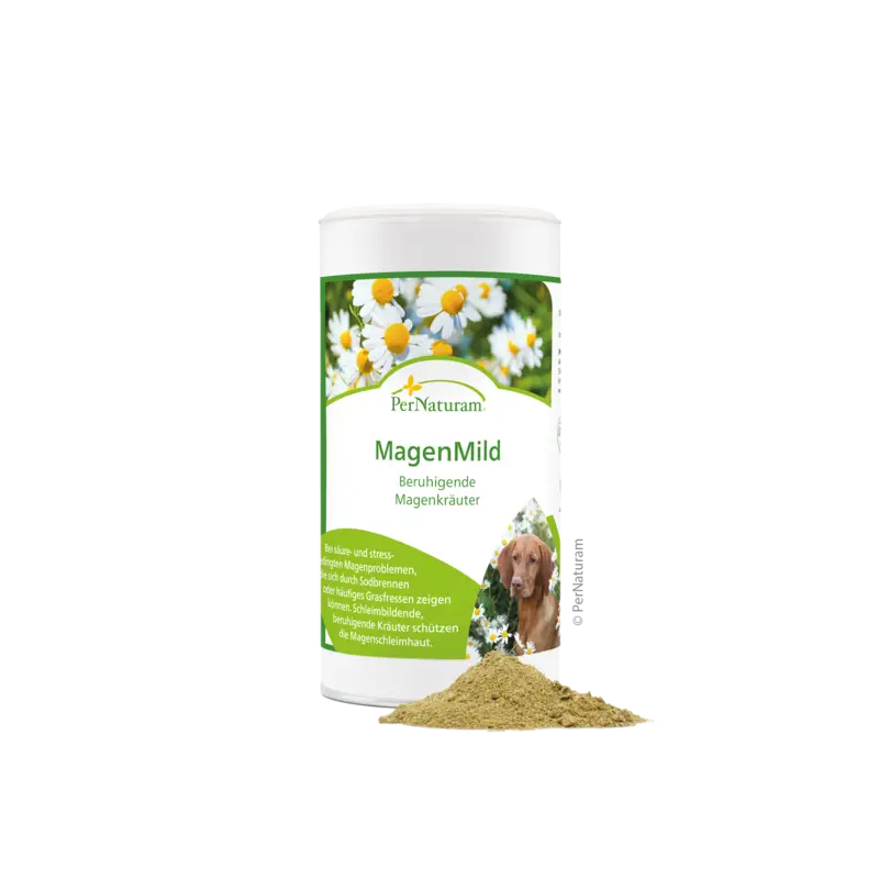 MagenMild ist ein Ergänzungsfuttermittel in Pulverform mit ausgewählten Kräutern, das als Teil der täglichen Ernährung für Hunde mit empfindlichem Magen gefüttert werden kann.