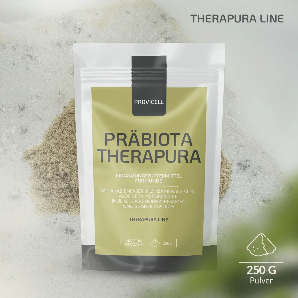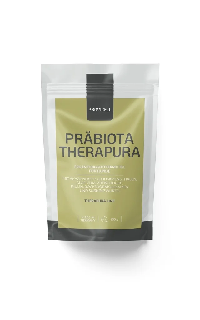 Präbiota Therapura ergänzt die tägliche Fütterung aus sorgfältig ausgewählten präbiotischen Ballaststoffen, wie Akazienfasern, Flohsamen und Inulin, die als natürliche Nahrungsquelle für nützliche Darmbakterien dienen.